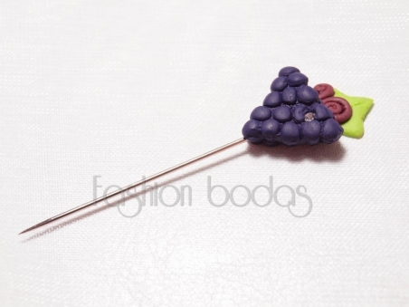 Graciosos alfileres de fimo en forma de frutas y verduras (la uva, la cereza, la pera, la calabaza y el tomate). Cada alfiler lleva incrustada una circonita. Los alfileres van surtidos.