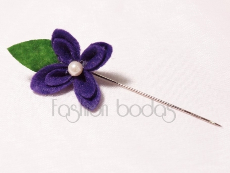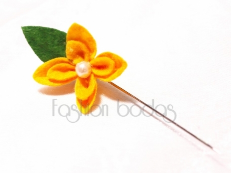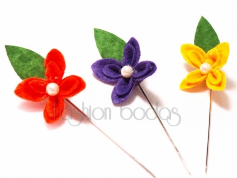 Bonito alfiler de fieltro en forma de flor con perlita en el centro. Los alfileres van surtidos en tres colores: el naranja, el amarillo y el lila.