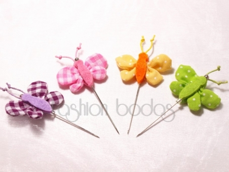 Extraordinarios alfileres hechos a mano de fieltro en forma de mariposa. Las mariposas tienen las antenitas de cuerda y las alas de tela estampada.