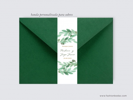 Elegante y moderna banda personalizada con vuestros nombres o iniciales para decorar tus sobres de las invitaciones de boda de nuestra colección BOTÁNICA VERDE