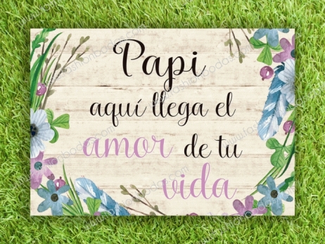 Cartel PAPI AQUÍ LLEGA EL AMOR DE TU VIDA para tu boda con flores malva y morados y con fondo de madera. Ideal para que lo lleven los pajes en vez de ramo o cestita :D