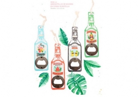 Abrebotellas de madera en forma de botella de vino, personalizado con diseños divertidos tropicales. Incluye cordón kraf.