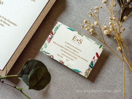 Una invitación de boda perfecta para enlaces clásicas con toque tropical y moderno. Combina una gama de colores de verdes, turquesas, rojos y tierra que la hacen elegante y perfecta para tu boda. Marca la diferencia con nuestra papelería a juego que tenemos con esta invitación de boda.