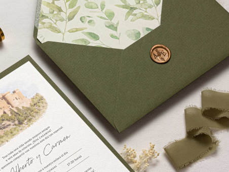 Elaboramos nuestras invitaciones de boda con cartulinas italianas con textura acuarela de 300g en color blanco (es rígida, natural con certificados y respetuosa con el medio ambiente, además fíjate en la textura rugosa tan bonita que tiene la cartulina) con sobre verde oliva de 140g a juego (posibilidad de cambiar el color del sobre sin ningún coste extra por otro como verde salvia, tostado, azul,...). El texto impreso es totalmente personalizado con vuestros datos. Incluye: invitación de boda, sobre, diseño, personalización y maquetas ilimitadas
