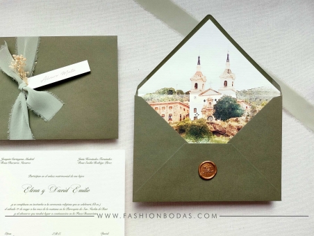 Elaboramos nuestras invitaciones de boda con cartulinas italianas con textura verjurada de 300g en color blanco roto (es rígida, natural con certificados y respetuosa con el medio ambiente, además fíjate en la textura rugosa tan bonita que tiene la cartulina) con sobre verde oliva de 140g a juego (posibilidad de cambiar el color del sobre sin ningún coste extra por otro como verde salvia, tostado, azul,...). El texto impreso es totalmente personalizado con vuestros datos. Incluye: invitación de boda, sobre, diseño, personalización y maquetas ilimitadas