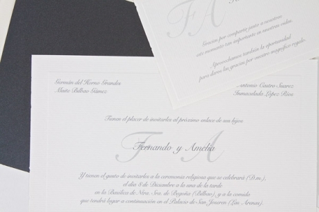 La clásica invitación confeccionada en cartulina blanca e impresa en color plata a juego con el forro.