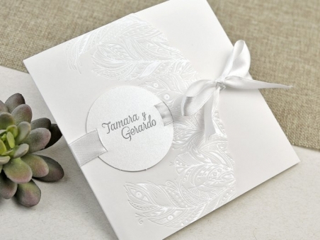 Invitación de boda elegante con unas plumas en relieve en la portada. Invitación de boda muy sencilla y estilosa que le encantará a todos vuestros invitados de boda. Ideal para boda con aire romantico y elegante. Elaborada en cartulina gruesa mate y brillo de aprox 260g.
