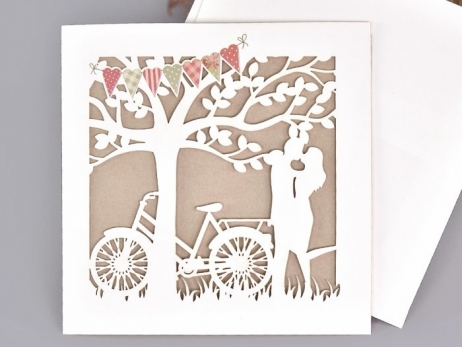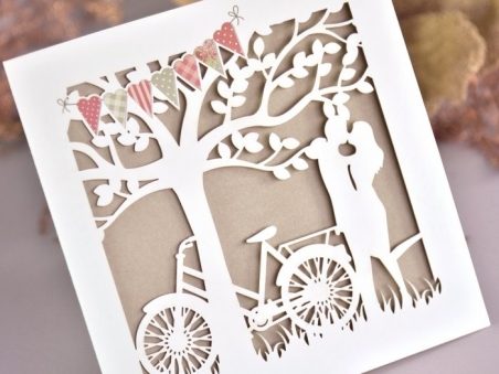 Invitación de boda muy original rustica y romantica con un divertido dibujo en la portada cortado a laser. Elaborada en cartulina gruesa de aprox. 260g.