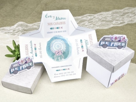 Invitación de boda muy original con forma de caja en tonos pasteles. Esta divertida invitación de boda es muy diferente y moderna, con un estilo hippy, ideal para bodas en la playa.