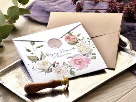 Invitación de boda vintage para novios románticos y detallistas En la portada tenemos un diseño floral, con tonos cálidos rodeando toda la tarjeta. Si las flores son el motivo principal de vuestra boda y no pueden faltar, aquí tienes la invitación perfecta para anunciar el enlace. El sello va impreso simulando que cierra la invitación (no se puede cambiar). En la parte trasera la invitación es gris con varios sellos, entre ellos París y Canadá.
