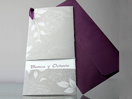 Invitación de boda elegante floral elaborada con cartulina gris de 260g con relieve de flores como se ve en las fotos, con lazo de organza lila. Ventanilla pretroquelada donde se puede ver los nombres de los novios impresos. La tarjeta de boda se desliza hacia arriba mostrando el texto
