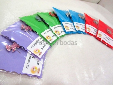 El precio incluye: material (celofan, lazos, plumas, rafia, cartulina etc ...) la mano de obra y te REGALAMOS la tarjetita personalizada con vuestros nombres y la fecha a juego con la presentación. NO incluye alfiler, hay que comprarlo aparte.
