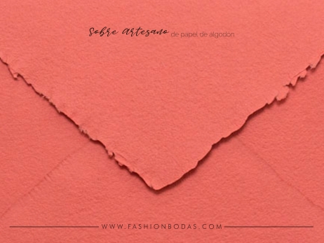 Sobres para invitaciones de boda C5 artesano elaborado de papel algodón con cierre de pico con un acabado artesanal. El color coral elegante y intenso, seguro harán juego con tus tarjetas de boda de formato A5 (medio folio o folio doblado). Papel algodón 100% natural y ecológico. Elaborado uno a uno, tintado a mano por lo que los colores y pigmentos pueden variar ligeramente de sobre en sobre.