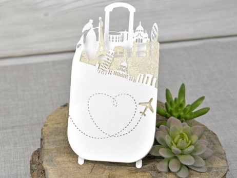 Invitación de boda viajes muy original cortada a laser y con imagenes viajeras y ciudades. Recorre las ciudades del mundo con esta invitación de boda original. La tarjeta de boda original se despliega en tres partes, con toques dorados para que resalte más. La parte dorada es rugosa y con brillo.Elaborada en cartulina gruesa de aprox 260g.